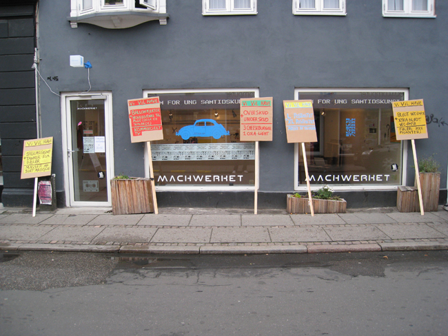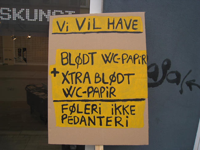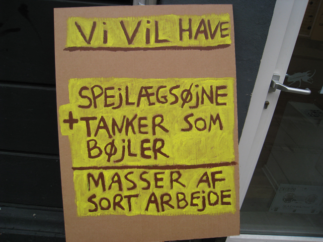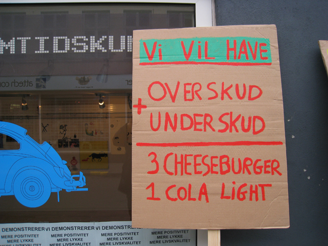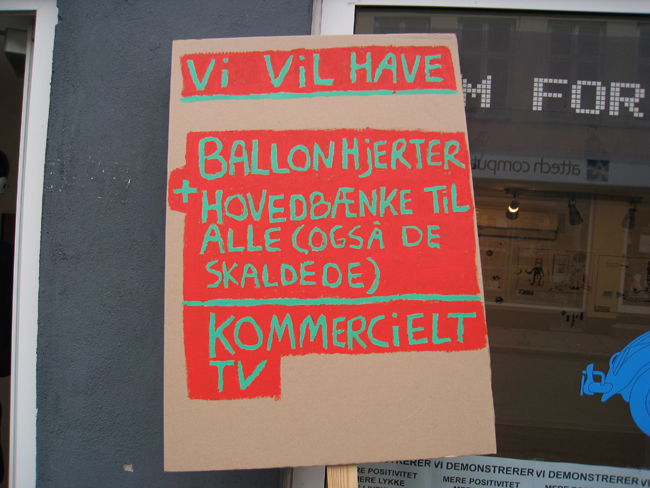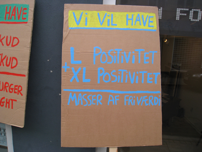 På kulturnatten i Århus (2008) havde jeg et arrangement i forbindelse med min udstilling - Banale Historier - i MACHWERKET. Arrangementet bestod af to dele: 1) performance og oplæsning og 2) en forladt demonstration for mere positivitet ---> mere lykke ---> mere livskvalitet.