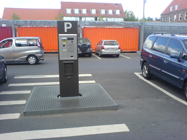 rapport fra vejle #11/p-automat/vedelsgade/parkeringspladsen ved bagindgangen til Føtex: Den her betalingsautomat til køb af P-billet er virkelig et arketypisk eksempel på en brugsgenstand, hvor form følger funktion, hvilket skyldes risten omkring automaten. Risten betyder, at hvis det regner, når man køber en billet, forbliver man tørskoet, netop fordi man står på en rist, så man ikke risikere at træde i en vandpytte, når man køber en billet. en funktion, der i et større perspektiv illustrerer det forhold, at hvis man køber en P-billet, får man ingen bøde!