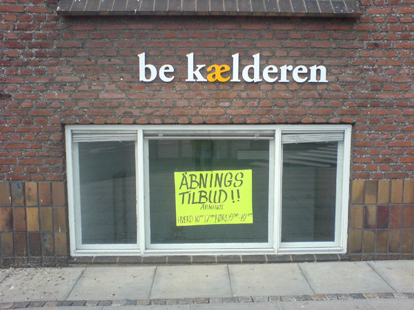 rapport fra vejle #5/be kælderen/gammelhavn-borgvold: Be kælderen om hvad? Mærkelig navn på en butik. Ved nærmere eftersyn viser det sig, at kælderen rummer en møbelforretning, dvs. skiltet mangler bogstaverne "mø" og "l", så der står møbelkælderen. Måske er det et smart reklamestunt ligesom jem og fix, der på tv2 reklamerer med, at de har sparet h'et i hjem for at kunne sælge varerne billigere....ja hvem ved? |